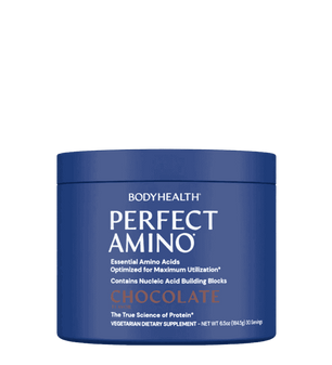 BodyHealth Perfect Amino Powder Chocolate levert een geoptimaliseerde mix van essentiële aminozuren en nucleïnezuren bouwstenen voor eiwitaanmaak. 99% benutting van aminozuren. Drinkmix poeder met chocoladesmaak. Geschikt voor vegetariërs en veganisten. 30 of 60 porties.