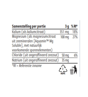 kaliumcitraat, magnesiumcitraat uit zeemineralen (Aquamin™ Mg), glycine, natuurlijke smaaktstof, ongeraffineerd zeezout, zuurteregelaars: citroenzuur, appelzuur, zoetstof: steviolglycosiden van stevia.
