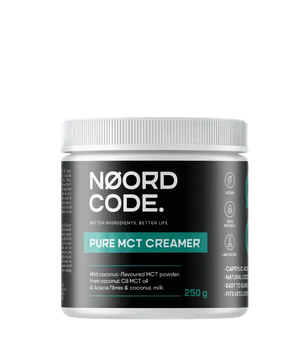 NoordCode Pure MCT Creamer bevat alleen C8 MCTs van duurzaam verbouwde kokosnoten. Acacia bevat prebiotische vezels, die de darmbacteriën voeden.