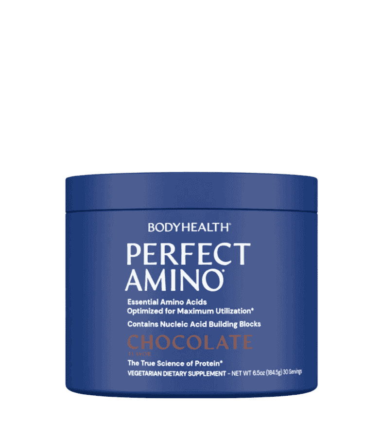 BodyHealth Perfect Amino Powder Chocolate levert een geoptimaliseerde mix van essentiële aminozuren en nucleïnezuren bouwstenen voor eiwitaanmaak. 99% benutting van aminozuren. Drinkmix poeder met chocoladesmaak. Geschikt voor vegetariërs en veganisten. 30 of 60 porties.