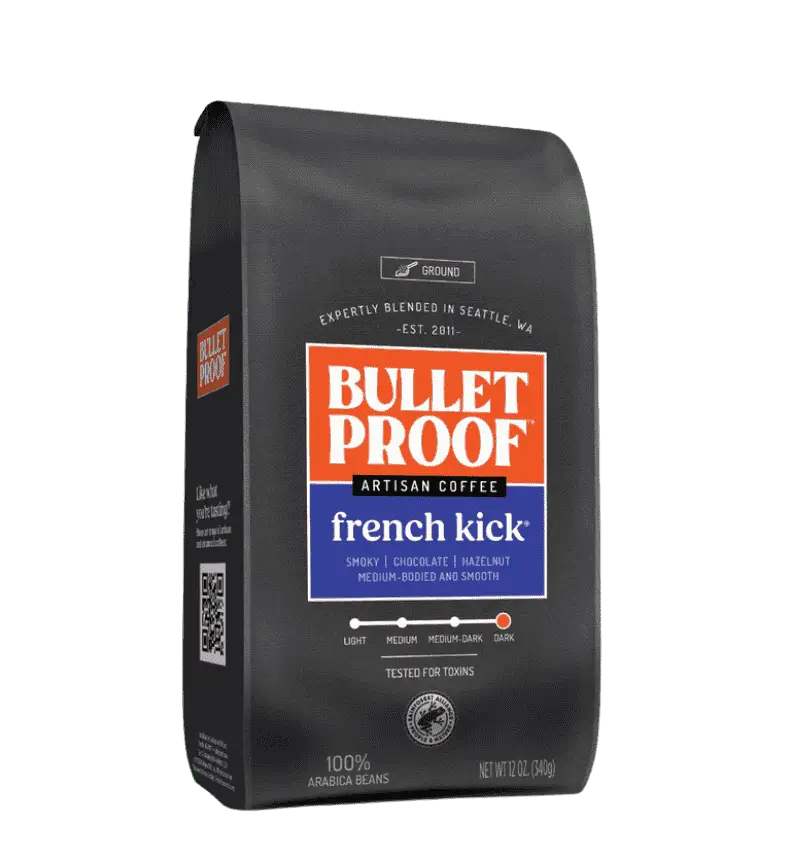 Eén pak Bulletproof French Kick Coffee Ground bevat 340 gram gemalen koffie.