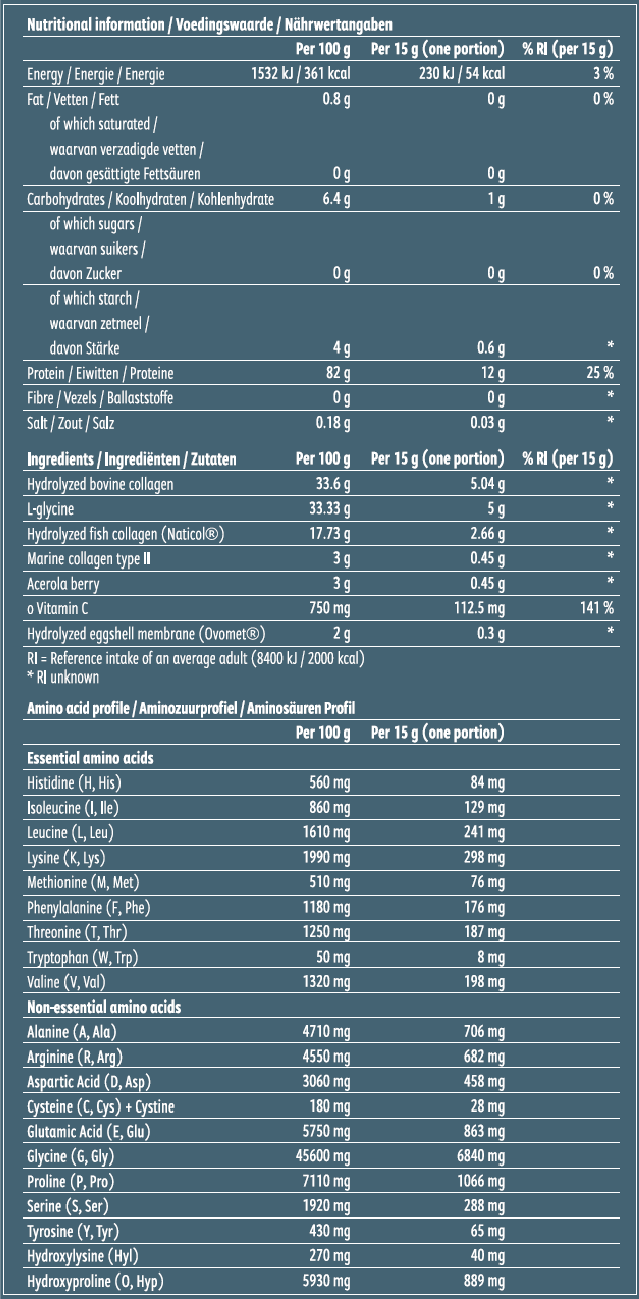 gehydrolyseerd rundercollageen (Naticol®), L-glycine, gehydrolyseerd viscollageen, natuurlijke sinaasappelsmaak, viscollageen type II, vitamine C (uit acerolabessen), gehydrolyseerd eierschaalmembraan (Ovomet®), appelzuur.