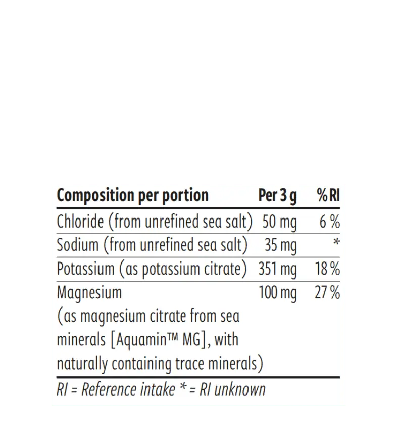 kaliumcitraat, magnesiumcitraat uit zeemineralen (Aquamin™ Mg), glycine, natuurlijke smaaktstof, ongeraffineerd zeezout, zuurteregelaars: citroenzuur, appelzuur, zoetstof: steviolglycosiden van stevia.