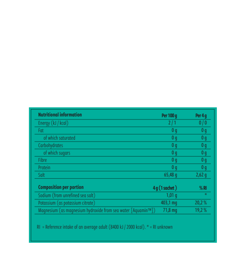 NoordCode Electrolytes bevat per portie 1,1 g natrium uit zeezout. Deze hoeveelheid zeezout levert ongeveer 1,6 g chloride.
