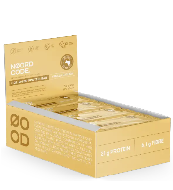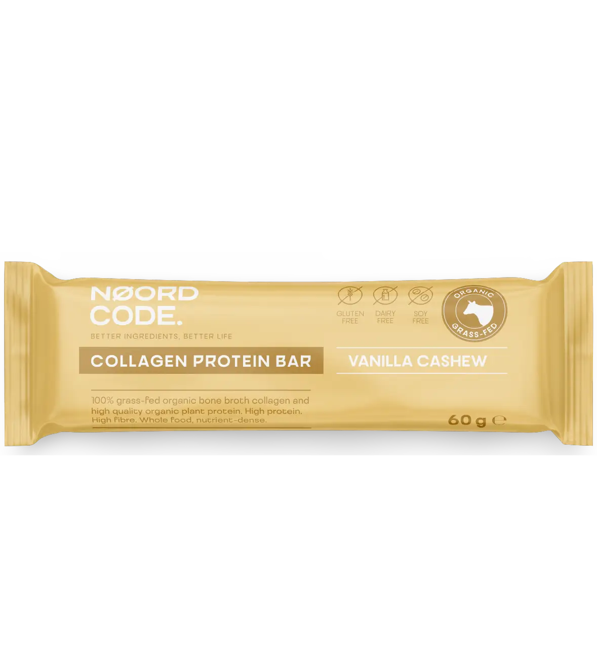 De NoordCode Organic Collagen Protein Bar Vanilla Cashew bevat eiwitten uit vier bronnen: