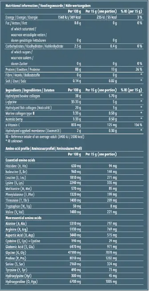 gehydrolyseerd rundercollageen, L-glycine, gehydrolyseerd viscollageen (Naticol®), marien collageen type II, vitamine C (uit acerolabessen), gehydrolyseerd eierschaalmembraan (Ovomet®).