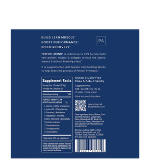BodyHealth Perfect Amino Travel Packets Mixed Berry bevat een unieke combinatie van essentiële aminozuren en nucleotidebouwstenen. De aminozuren zijn nauwkeurig uitgebalanceerd voor optimale eiwitsynthese in het lichaam. De nucleotidebouwstenen leveren de benodigde materialen voor de productie van DNA en RNA in de cellen. Elk sachet bevat 6,58 gram poeder om te mengen met water tot een aminozuurdrank met mixed berry-smaak.