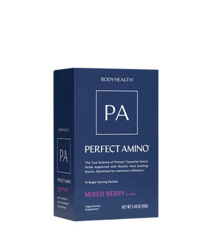 Het lichaam gebruikt aminozuren als bouwstenen voor eiwitten. Omdat het lichaam essentiële aminozuren niet zelf aanmaakt, moet je deze via voeding binnenkrijgen. BodyHealth Perfect Amino is een gemakkelijke manier om essentiële aminozuren in te nemen.