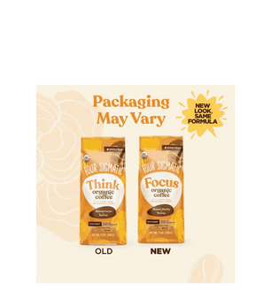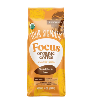 Four Sigmatic Focus Coffee Whole Beans (voorheen Think Whole Bean Coffee) met dark-roasted Arabica koffiebonen en dubbelextract van Lion's Mane en yaconsap poeder. Mycotoxine vrij. Pak van 340 gram.