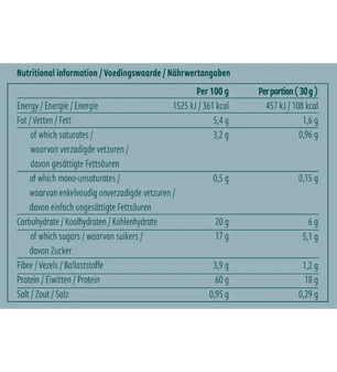 Wei-eiwitconcentraat (80%)* (74.8%) (melk), kokosbloesemnectar*, cacaopoeder (ongealkaliseerd)*.